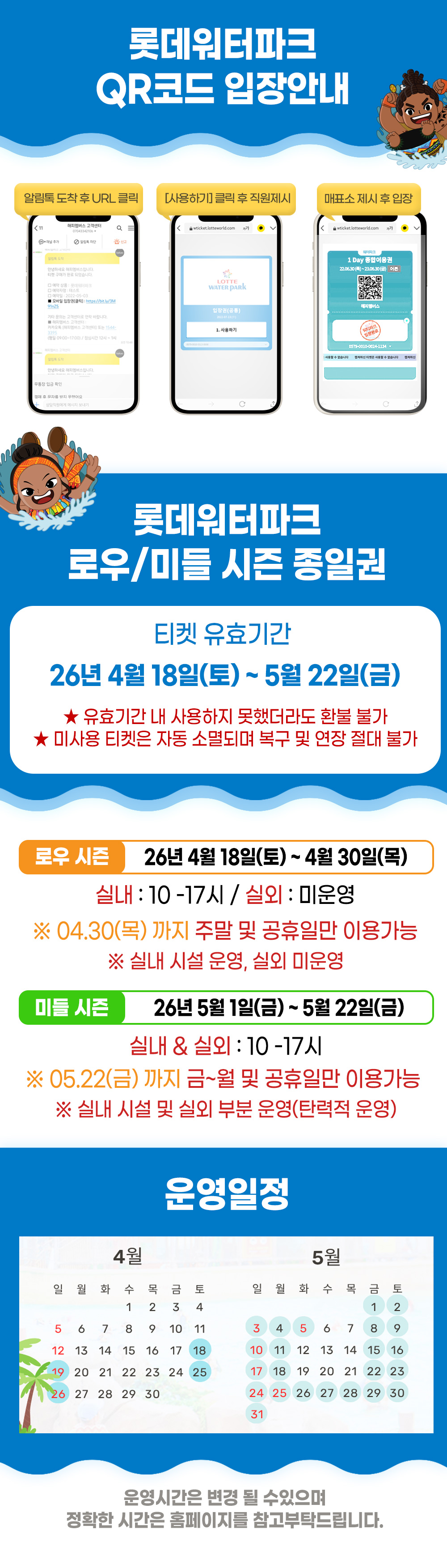 - 실외워터파크 동일하게 운영하되, 상황에 따라 운영대기 할 수 있습니다.